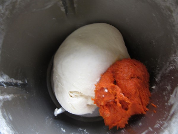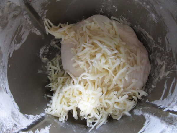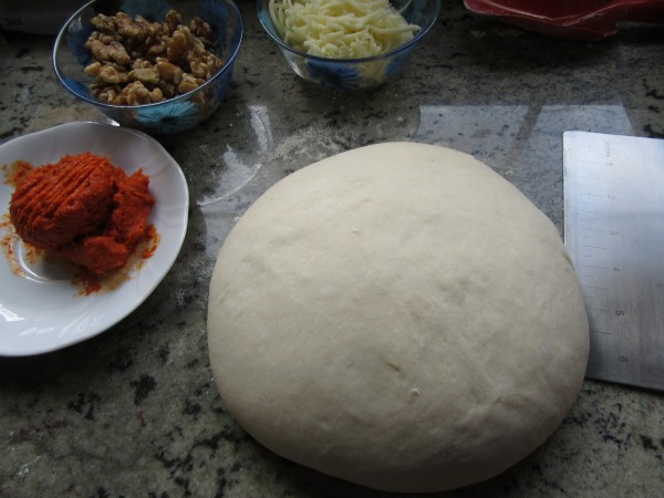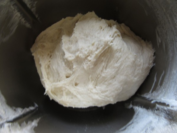 2- Harina, sal, aceite y azúcar, 5 min. Espiga. Sacar la masa sobre la meseta espolvoreada de harina, formar una bola y dejar tapada como 20-30 minutos.