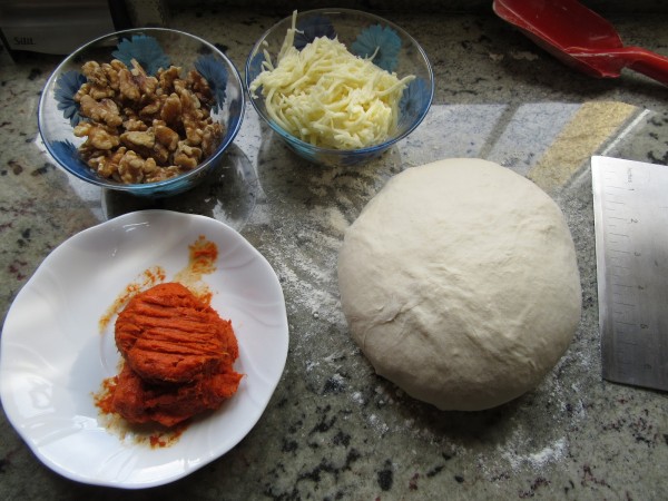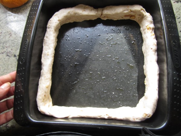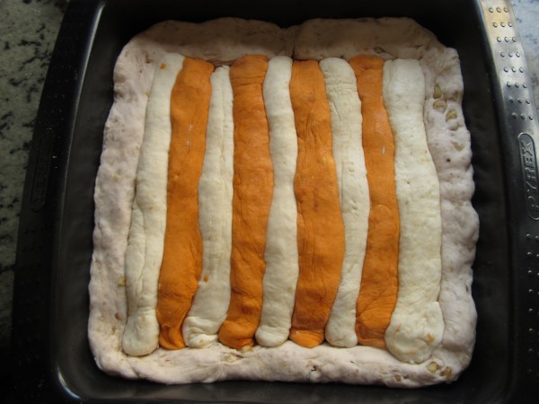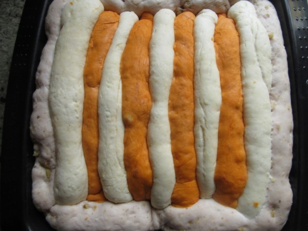 4- Formar una tira larga con la masa de nueces y colocar alrededor de un molde engrasado,de unos 24x24 cm. Formar 4 tiras con la masa de sobrasada y 5 tiras con la de queso e ir colocando dentro del molde, alternándolas. Empezar y terminar con la de queso. Tapar y dejar levar como 1-2 horas, en un lugar cálido, que doble su volumen.