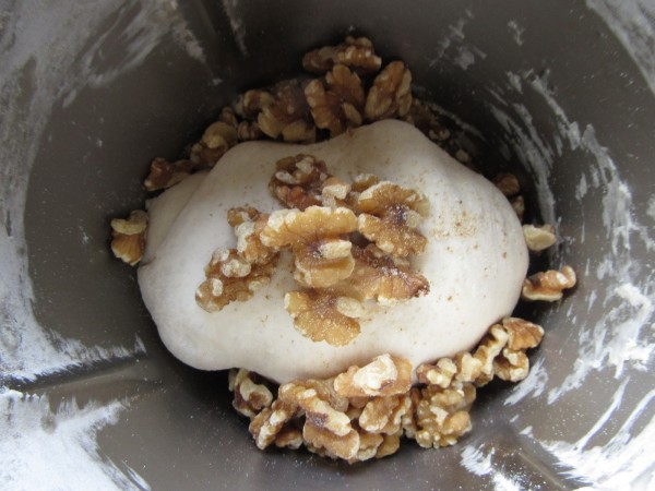 3- Dividir en 3 partes, e introducir cada parte con cada ingrediente. Primero con el queso, 1 min. Espiga. Después con las nueces, 1 min. Espiga y por último, con la sobrasada, 1 min. Espiga. Así no tendremos que lavar el vaso. (A la de sobrasada le pongo algo más de harina).