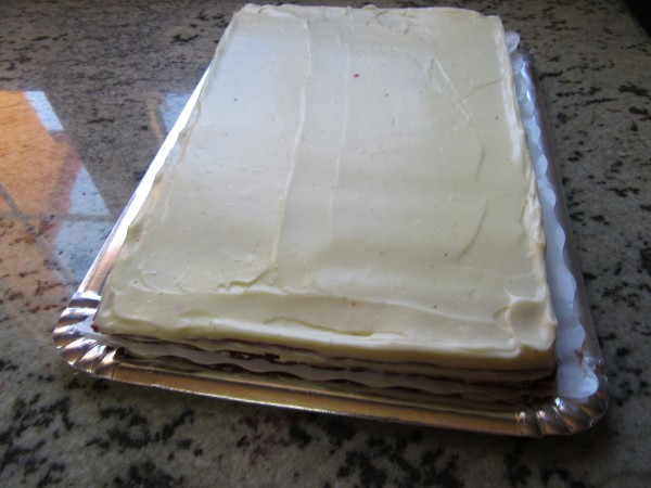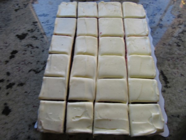 Cortar la plancha en dos partes iguales, rellenar y cubrir. Llevar a la nevera, cortar en porciones pequeñas y adornar a gustos.