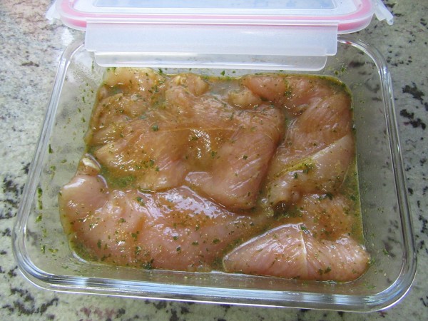 1- Cortar las pechugas en filetes un poco gruesos. Colocar en un tupper.