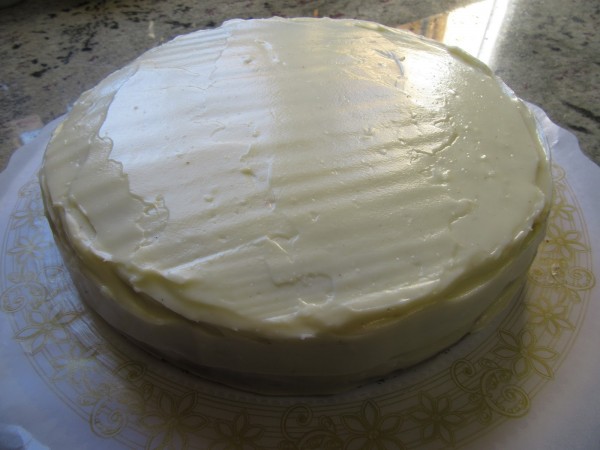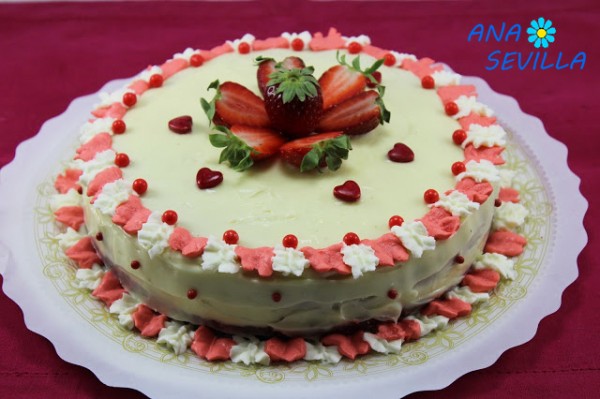 Cortar el bizcocho en dos/tres partes iguales, rellenar y cubrir. Llevar a la nevera.