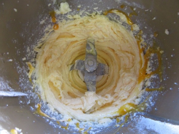 4- En vel. 3, ir echando yema a yema por el bocal. Agregar el brandy, ralladura, vainilla y mezcla de harinas, 10 seg. vel.6. Despegar de las paredes.