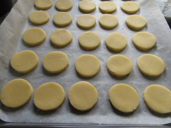 6- Cortar con cortapastas, llevar a la bandeja levantándolos con una espátula y hornear (180º), unos 8 a 10 minutos. Quedarán blanquitos. Dejar enfriar totalmente, pues es una galleta muy delicada.