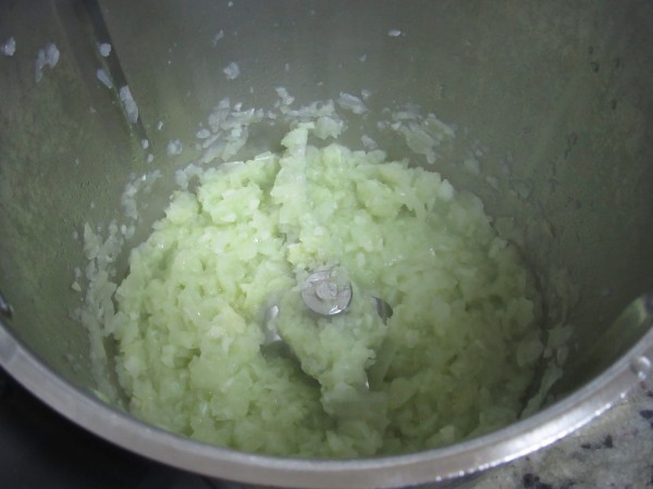 2- Picar la cebolla y ajos, 2 seg. vel.5. Añadir el aceite y sofreír 12 min. Varoma, vel. cuchara, sin cubilete.