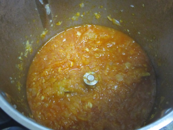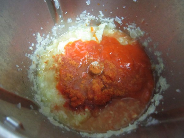 3- Agregar el tomate frito, vino blanco y pimentón, 5 min. Varoma, vel cuchara. Sin cubilete, para favorecer la evaporación del alcohol.