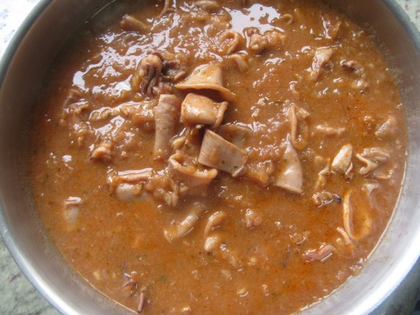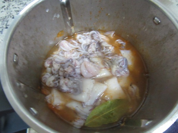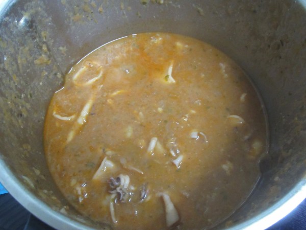 4- Chipirones, caldo, laurel, perejil, sal y pimienta, 18-20 min. Varoma, giro izda, vel. cuchara. Con cubilete. Reservar en un bol tapado.
