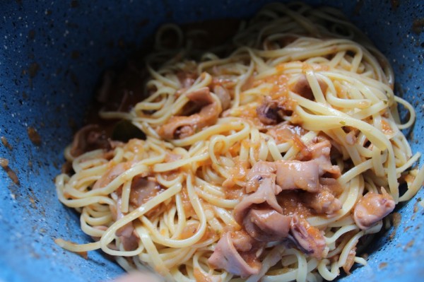 Espaguetis con chipirones encebollados
