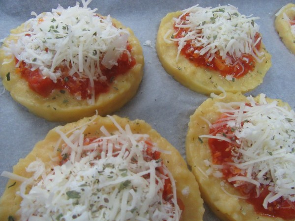 4- Sobre una bandeja forrada con papel de hornear, echar 2 cucharadas de la tortilla (Podéis usar un aro de emplatar) y encima una del sofrito de tomate, espolvorear con queso rallado y orégano. A mí me salen unas 6 tortillitas.