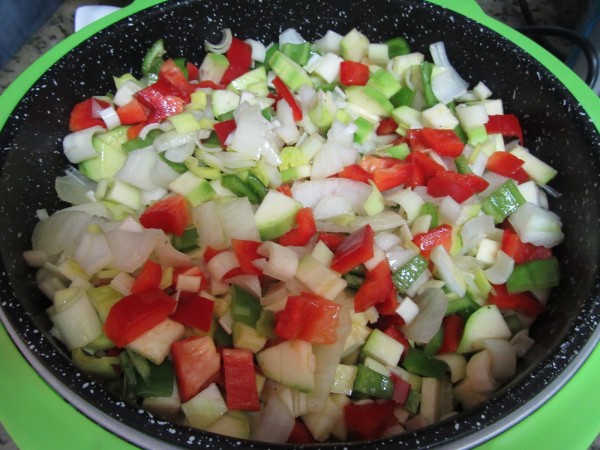 1- Pochar la cebolla, ajos, pimiento, calabacín picaditos en el aceite, menú SARTÉN, 20 minutos, 240º.