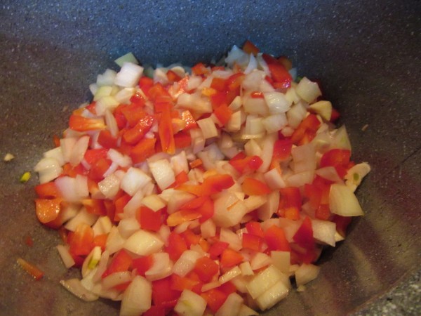2- En ese mismo aceite pochar las cebolla, ajos y pimiento picados no muy menudos unos 15-20 minutos en menú freír.