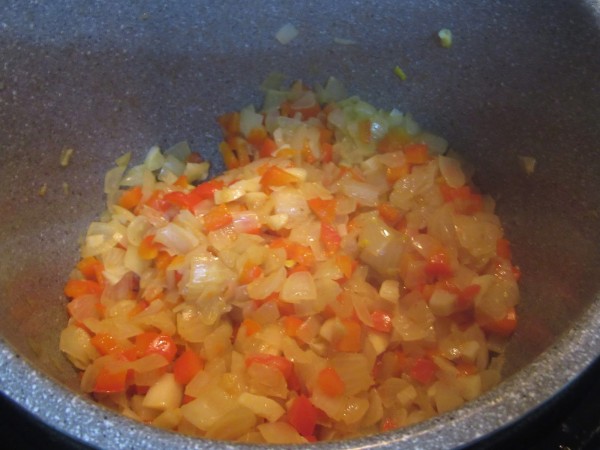 2- En ese mismo aceite pochar las cebolla, ajos y pimiento picados no muy menudos unos 15-20 minutos en menú freír.