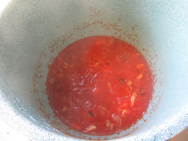 2- Agregar el tomate, pimentón, canela y vino blanco, remover, válvula cerrada, menú turbo, 3 minutos, 130, alta presión. Después triturar junto con el caldo de pescado.