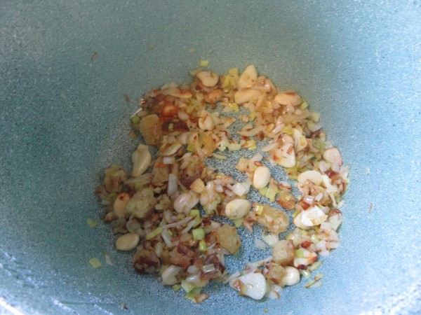 Preparación:1- Picar la cebolla y puerro, sofreír junto a los ajos laminados, tacos de pan y almendras, con un chorro de aceite en menú freír hasta que quiera tomar color.
