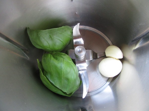 1- Picar los ajos con la albahaca o hierbabuena, 4 seg. vel.5. Reservar.