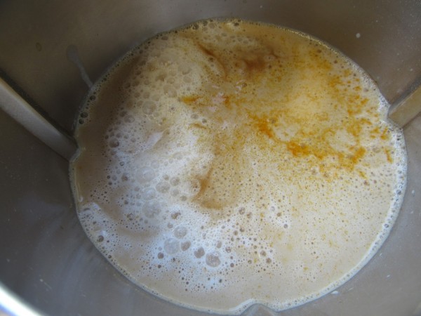 1- Todos los ingredientes, menos el sobre de caramelo, al vaso, 8 min., 90º, vel.4. Que llegue a ésa temperatura.