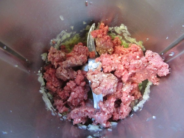 3- Añadir la carne, remover con la espátula, 4 min., 100º, giro izda., vel. 1.