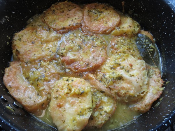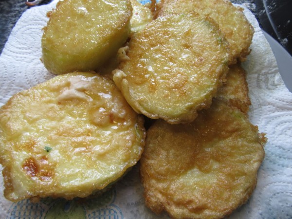 1- Cortar el calabacín en rodajas un poco gruesas, salar, pasar por harina (sacudiéndolas para quitar el exceso), pasar por huevo batido y freír en el aceite bien caliente, sólo que se dore el rebozado. Ir colocándolas en una cacerola. Reservar.