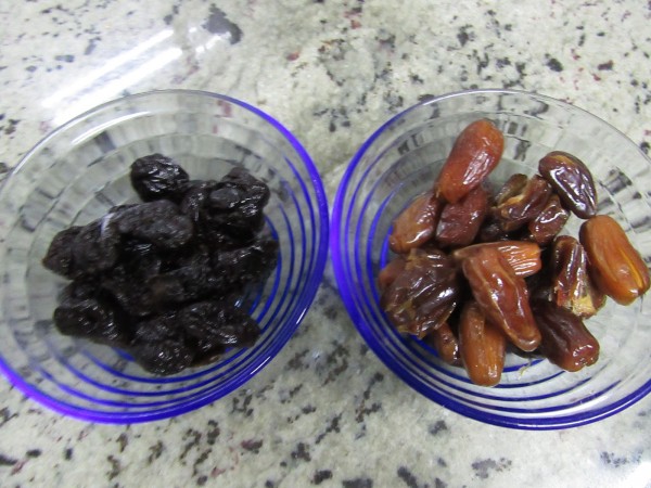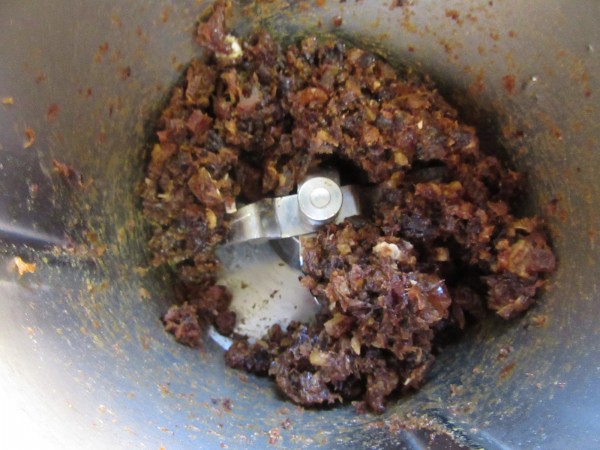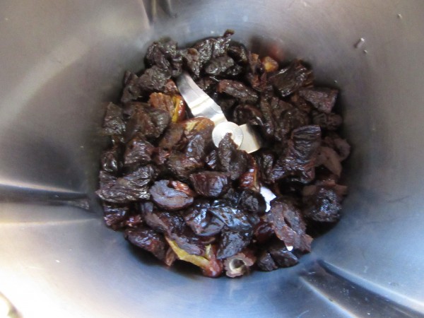 1- Picar los dátiles y ciruelas en trozos, echar al vaso, 5 seg. vel.6.