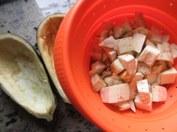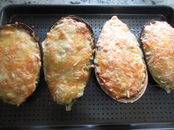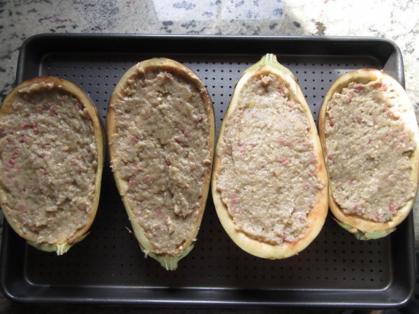 1- Vaciar las berenjenas abriéndolas transversalmente. Pasar una puntilla por todo el borde así os será muy fácil. Cortar la pulpa en dados y poner en un escurridor con sal una media hora, para que suelten el amargor. Reservar los cascos sumergidos en agua con un chorrito de vinagre para que no se pongan oscuros y se oxiden..