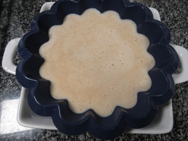 3- Colar la leche sobre el pan en trozos, volver todo al vaso, añadir los huevos y triturar, 20 seg. vel.10. Volcar sobre un molde caramelizado, introducido en una fuente con agua hirviendo, que llegue sobre la mitad del molde.