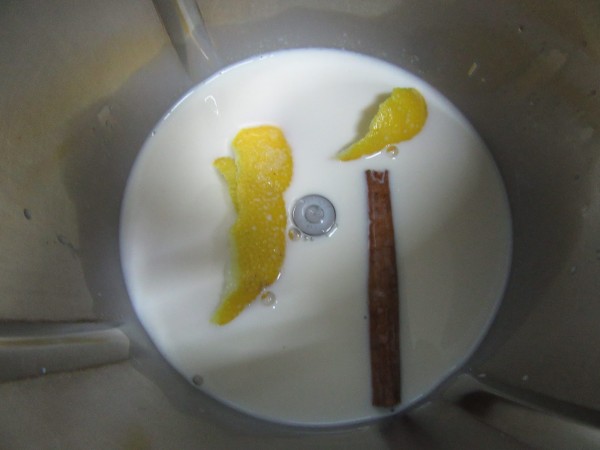 1- Leche, piel limón, palo canela y azúcar, 5-6 min., 100º giro izda, vel. cuchara. Que llegue a esa temperatura. Dejar 10 minutos, dentro del vaso para que infusione.