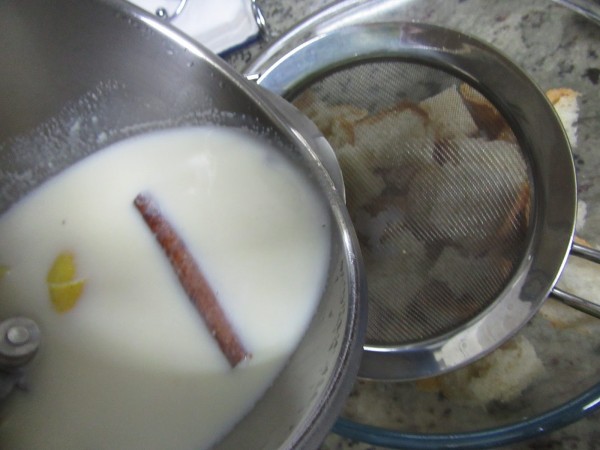 3- Colar la leche sobre el pan en trozos, volver todo al vaso, añadir los huevos y triturar, 20 seg. vel.10. Volcar sobre un molde caramelizado, introducido en una fuente con agua hirviendo, que llegue sobre la mitad del molde.