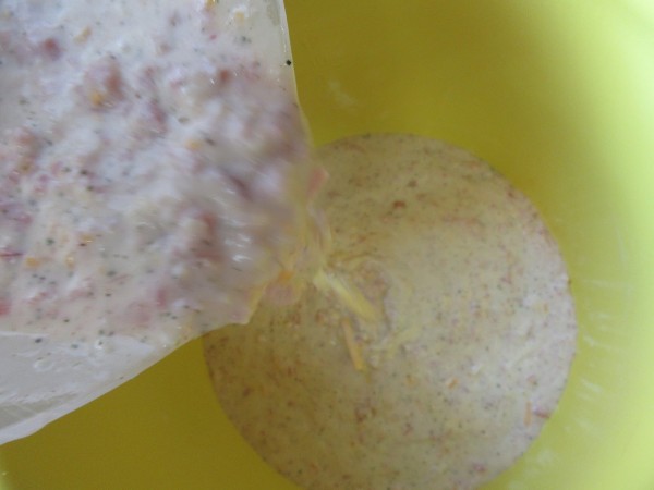 Preparación:1- En una jarra amplia, mezclar con el turmix la leche, huevos., harina, levadura, orégano y sal, hasta que no queden grumos. Añadir el jamón en trozos, bacon en tiras y queso rallado y triturar pero que queden trocitos que se noten.