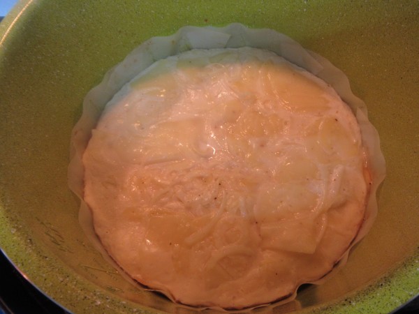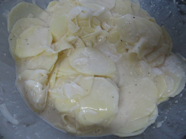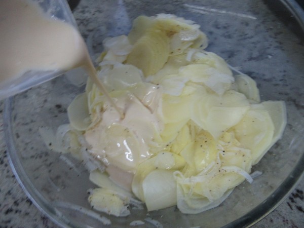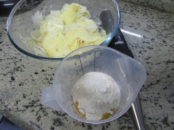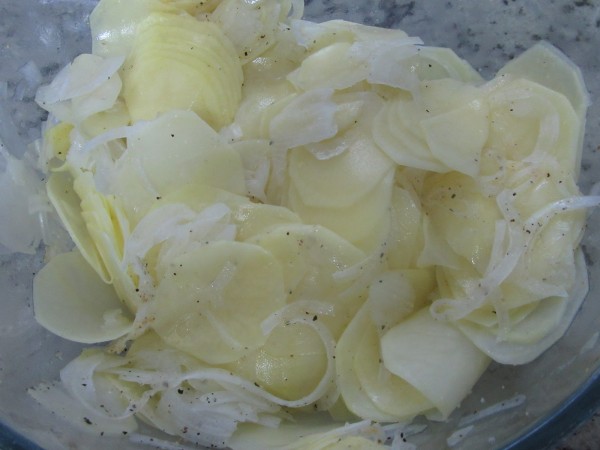 Preparación:1- Cortar la cebolleta y las patatas en láminas muy finas. (Mejor con mandolina, el corte mínimo). Salpimentar, espolvorear ajo en polvo y mezclar bien. Reservar en un bol amplio.