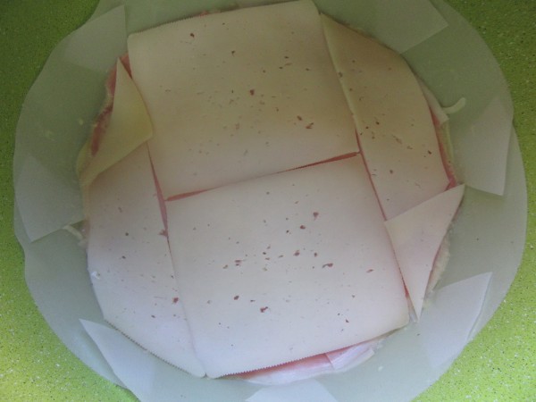 3- En la cubeta forrada de papel de hornear, repartir la mitad de las patatas alisando bien, cubrir con jamón cocido, queso y jamón cocido y resto de patatas.