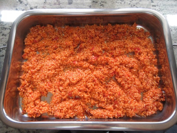 3- Agregar el tomate troceado, 6 min., Varoma, vel. 1. A continuación el pimentón y arroz, 1 min., 100º, giro izda., vel. 2. Extender en una fuente grande o paellera para horno.