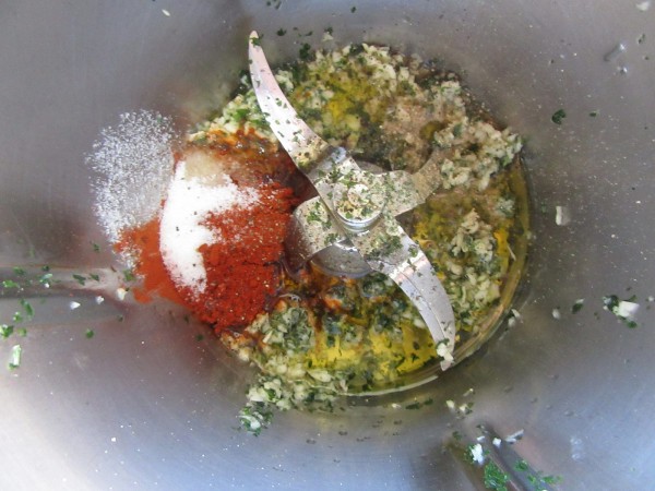 2- Picar los ajos y perejil, 5 seg. vel.5. Bajar restos hacia las cuchillas.