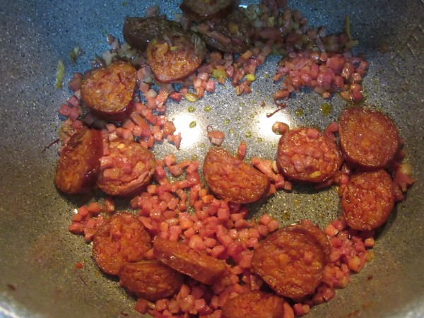 Sofreir chorizo y jamón