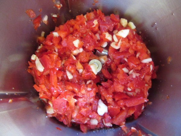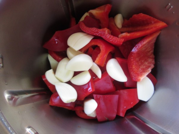 1- Picar los pimientos y ajos, 6 seg. vel.4. Bajar restos hacia las cuchillas, añadir el aceite y sal, sofreír 12 min., Varoma, vel. cuchara. Sin cubilete.
