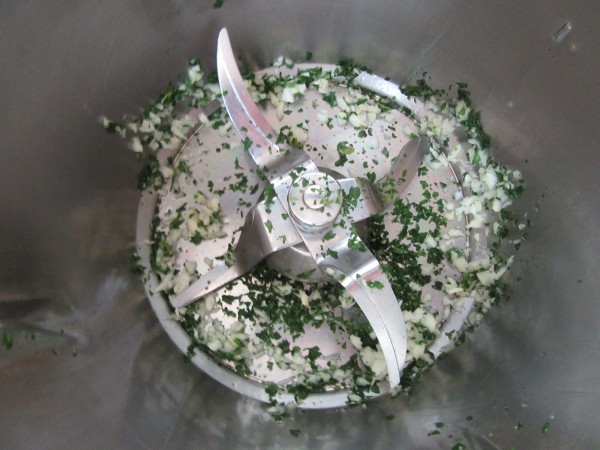 1- Picar los ajos y perejil. 4 seg. vel.5. Bajar restos hacia las cuchillas.