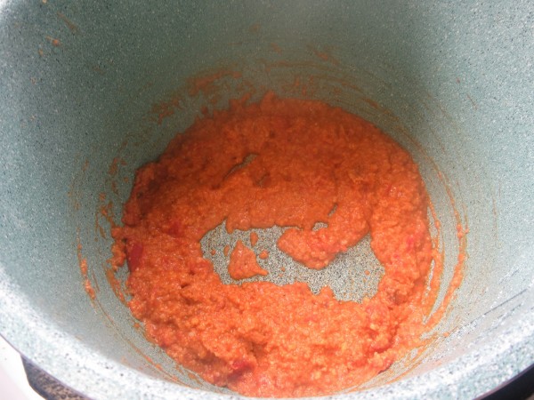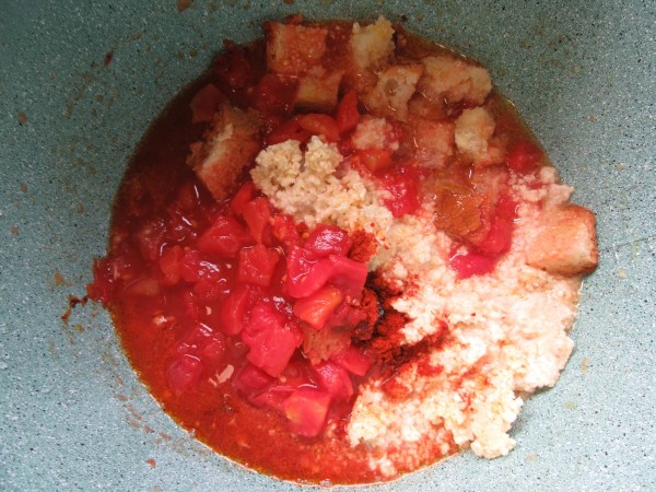 2- Triturar los ajos con las almendras hasta que quede una pasta. En un chorro de aceite, sofreír la picada con el pan en tacos, pimentón, vino blanco, tomate troceado unos 8-10 minutos a 140º.