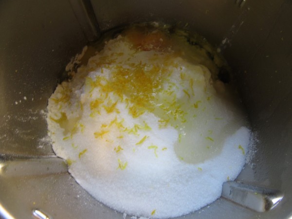 2- Quitar la cáscara y añadir el zumo, anís, harina, azúcar, huevo, ralladura y levadura, 30 seg. vel.6.