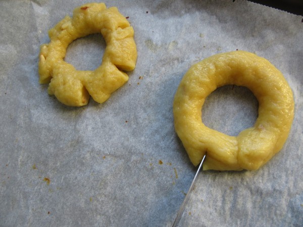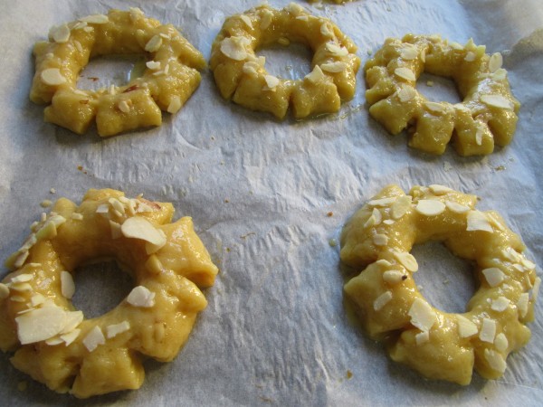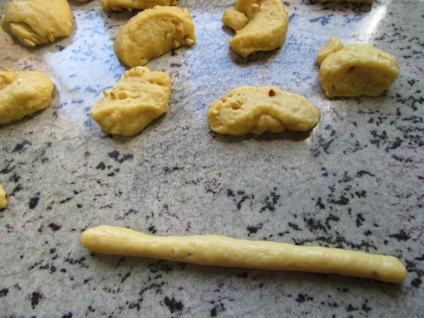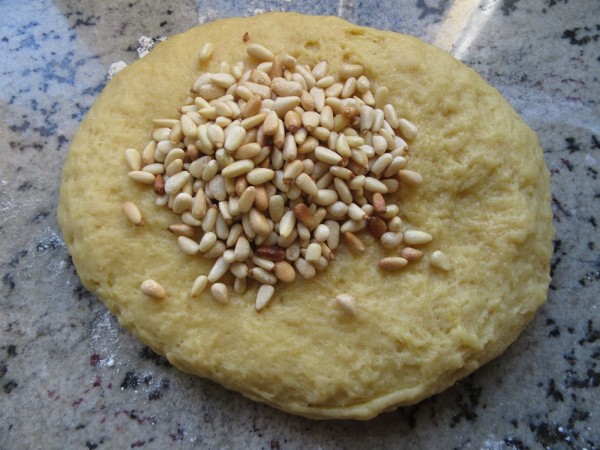 4- Pasar la masa a la meseta espolvoreada con un poco de harina e integrar los piñones. Cortar porciones de unos 75 gr. Formar tiras, unir extremos pellizcando un poco la masa, hacer unos cortes, pintar con huevo y espolvorear almendra.