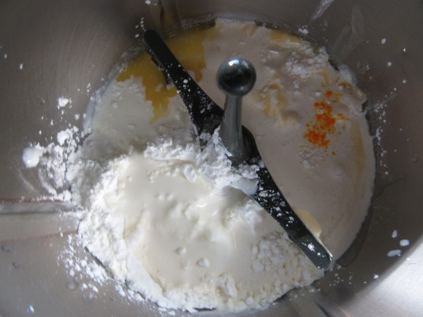 1- Colocar la mariposa, azúcar, ralladura o esencia, yogurt, nata, mantequilla, maizena, queso de untar , huevos y colorante, 10 seg., vel.4. Después programar 10 min. 100º, vel.2 1/2.