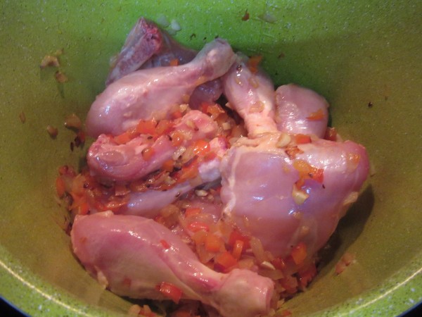 2- Pochar la cebolla, 3 ajos y pimiento menudos en un chorro de aceite en menú freír. Cuando esté la verdura blanda, sofreír un poco el pollo removiendo.