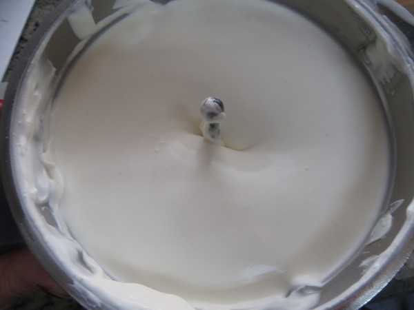 2- Colocar la mariposa, semi-montar el resto de nata (750 gr.), con el azúcar glas y la vainilla, unos segundos en vel. 4.