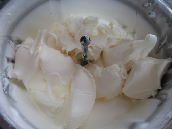 2- Colocar la mariposa, semi-montar el resto de nata (750 gr.), con el azúcar glas y la vainilla, unos segundos en vel. 4.