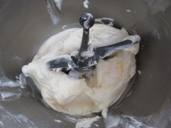 2- Colocar la mariposa, Batir la mantequilla con el azúcar glas, 2 min., vel.3. Bajar restos , añadir la leche con café fría, 1 min., vel.4. Quitar la mariposa y terminar de envolver. Llevar unos 10-15 minutos a la nevera.