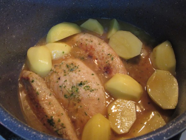 3- Agregar el caldo, laurel y perejil picado. Aquí podéis poner unas patatinas pequeñas.