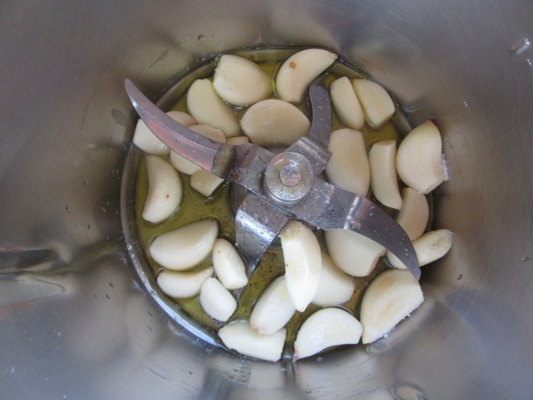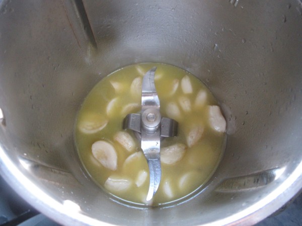 2- Confitar los ajos enteros, sal y el aceite de dorar la carne, (Unos 25 gr.), 15 min., 100º, giro izda, vel. cuchara.