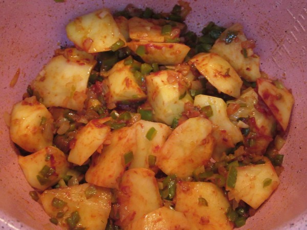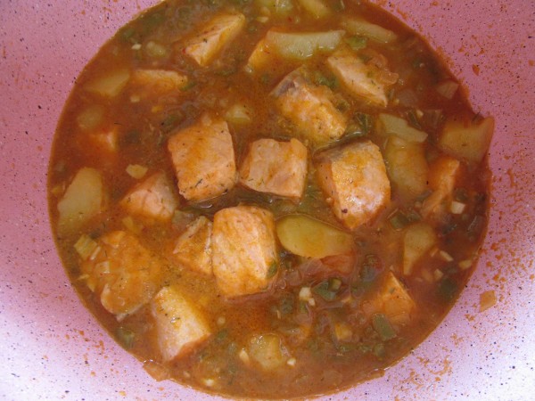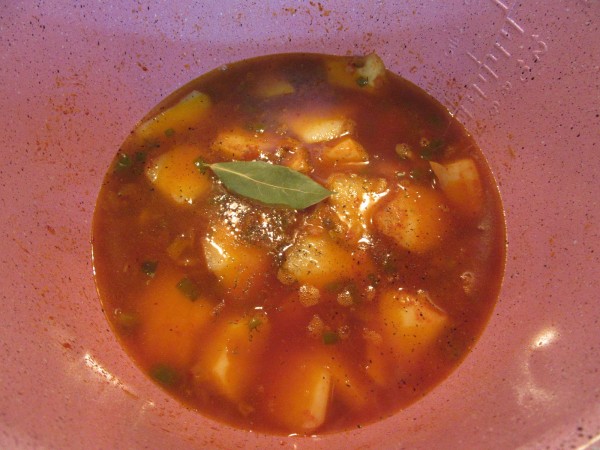 *Patatas chascadas significa que al picarlas, claváis un poco el cuchillo y arrancáis, así sueltan el almidón durante la cocción y la salsa quedará más trabadita.