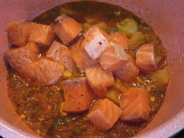 Preparación:1- Cortar el salmón en dados, salpimentar y espolvorear eneldo. Reservar.