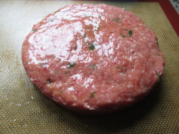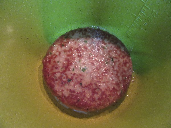 1- Adobar la carne con 1 huevo, sal, pimientas, ajo en polvo, cebolla en polvo y perejil. Formar una hamburguesa de unos 16 cm. diámetro, engrasar alrededor con aceite con una brocha y sellar en la cubeta, en menú freír solo dorar la carne por fuera, vuelta y vuelta. Dejar enfriar.