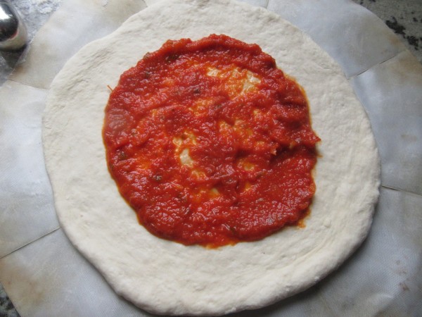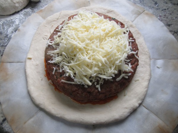 3- Amasar un poco para quitar el aire. Con la mesa espolvoreada con harina. Dividir en dos bolas de unos 250 gr. Aplastar con el rodillo ambas, como si fueran dos pizzas, diámetro algo más grande que la cubeta. Sobre papel de hornear, colocar la masa, extender el tomate, colocar la hamburguesa y cubrir con queso. Pincelar con agua los bordes, tapar y sellar. Introducir en la cubeta y pinchar un poco con un palillo.