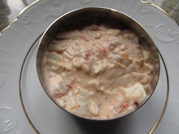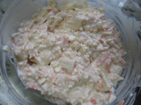 5- Picar los gambones en trozos, unir a la salsa rosa.